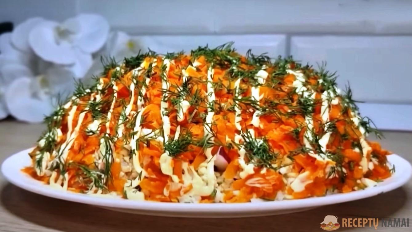 majonezu. Sutarkuokite virtas morkas ir uždėkite jas ant kiaušinių sluoksnio. Susmulkinkite krapus ir pabarstykite jais salotų viršų.