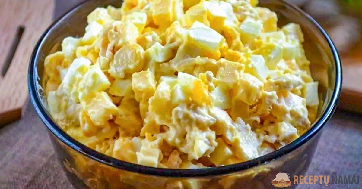Salotas užpilame majonezu ir patiekiame į stalą.