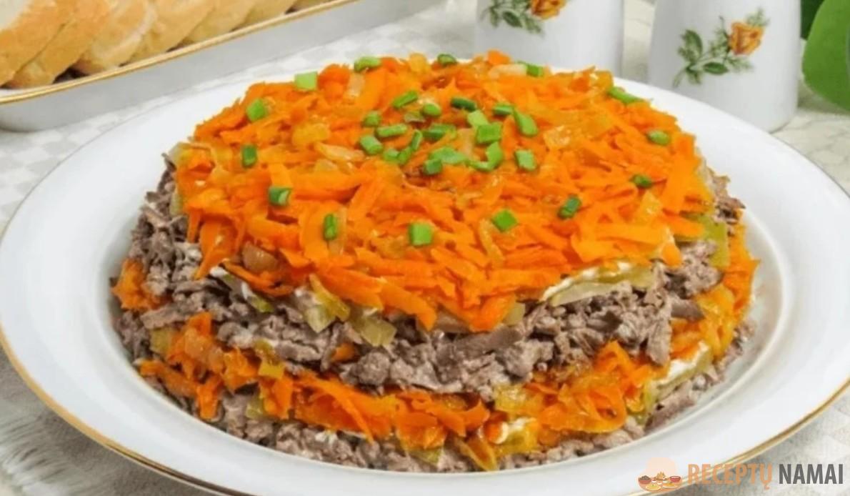 Į salotinę dėlioju sluoksniais: plaučius, svogūnus, morkas ir vėl plaučius, svogūnus, morkas. Tarp sluoksnių truputį majonezo arba grietinės pagal skonį