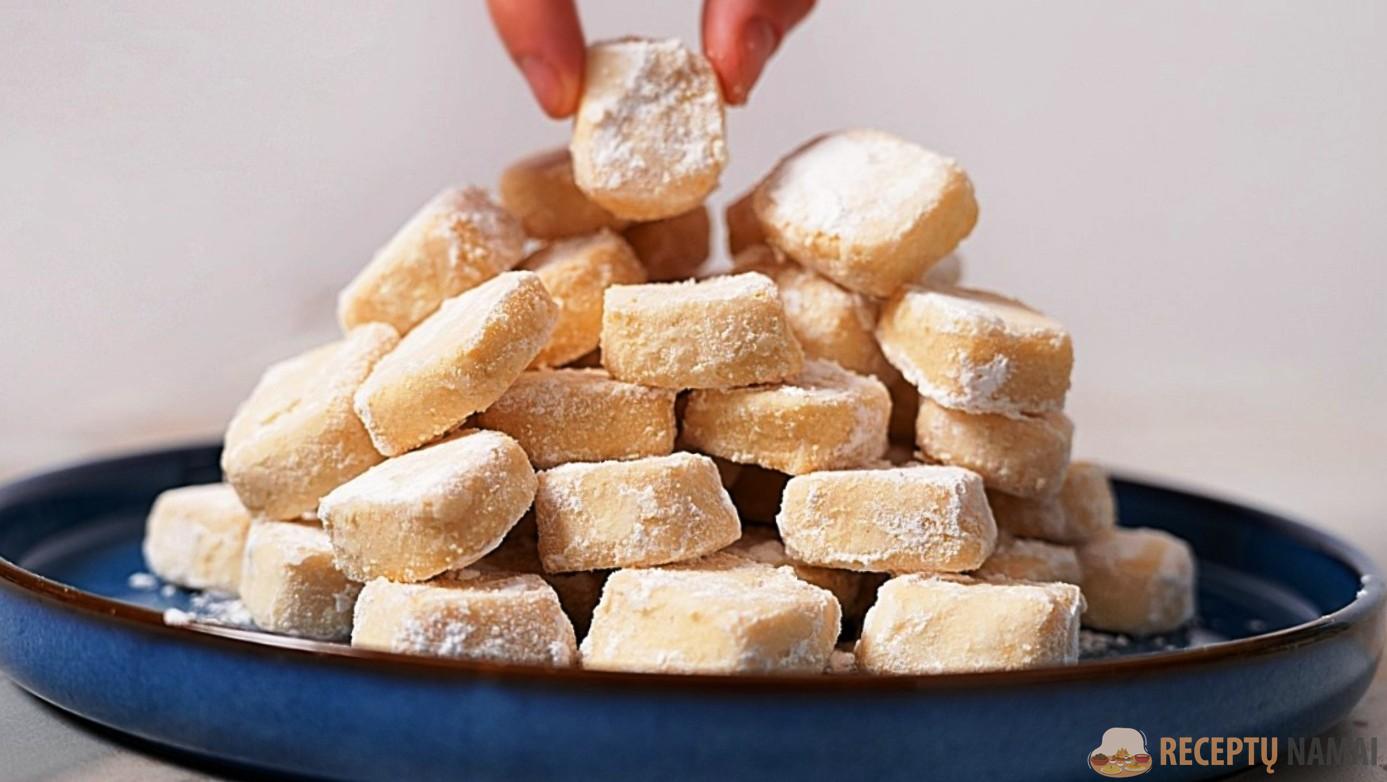 Iškepusius sausainius galite apvolioti cukraus pudroje. Jei norite, į miltelius galite įberti cinamono, kad sausainiams suteiktumėte ypatingą skonį.