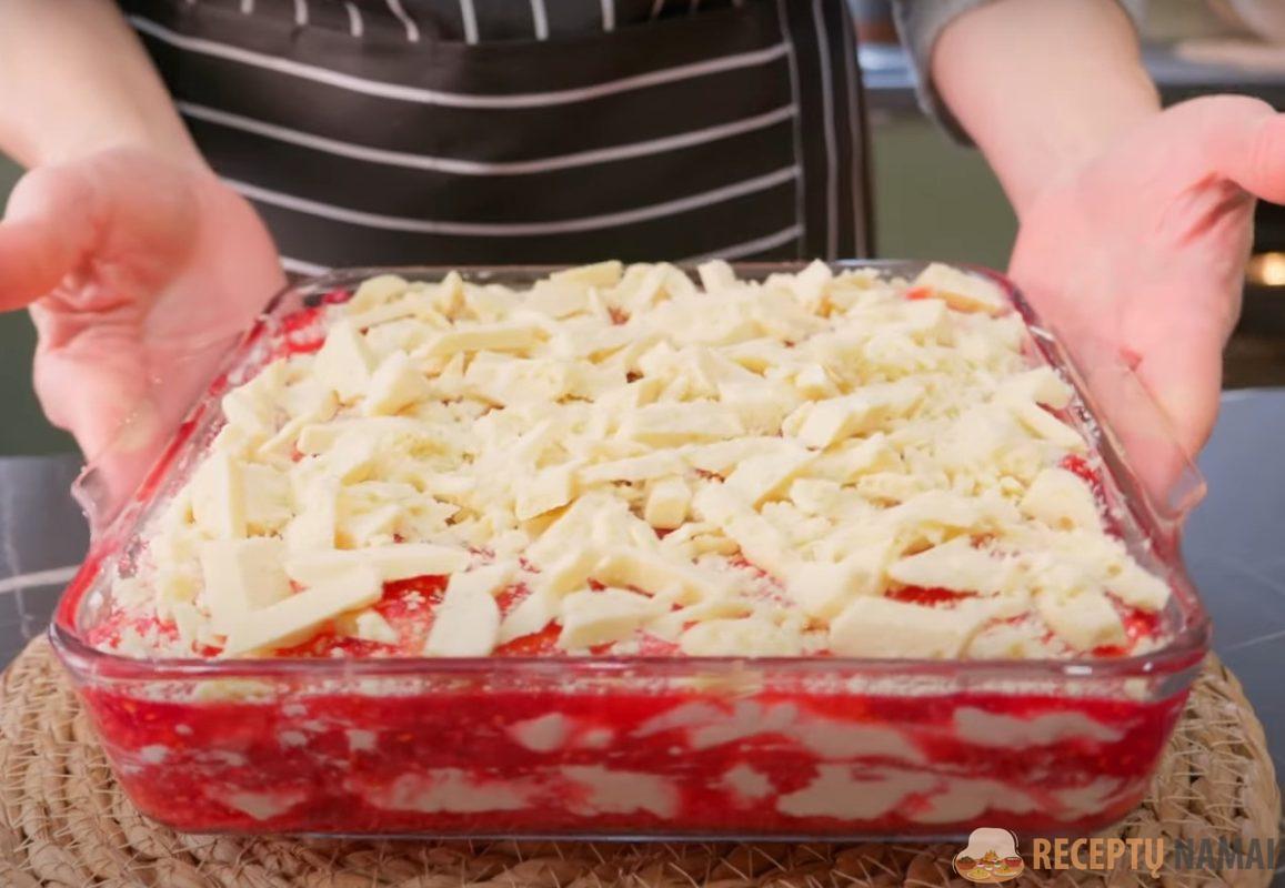 Šiuo metu desertą galite papuošti kapotu baltuoju šokoladu.