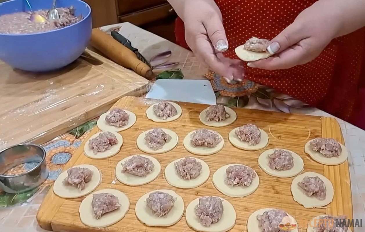 Kai tešla paruošta minkyti, nupjaunu gabalėlį, plonai iškočioju ir išpjaunu apskritimus. Galite formuoti ir kitaip – kaip jums patogiau. Ant kiekvieno apskritimo dosniai dedu įdaro, nes mėgstame, kad koldūnai būtų su daug mėsos. Kraštus atsargiai užsandarinu – pirmiausia per vidurį, tada šonus.