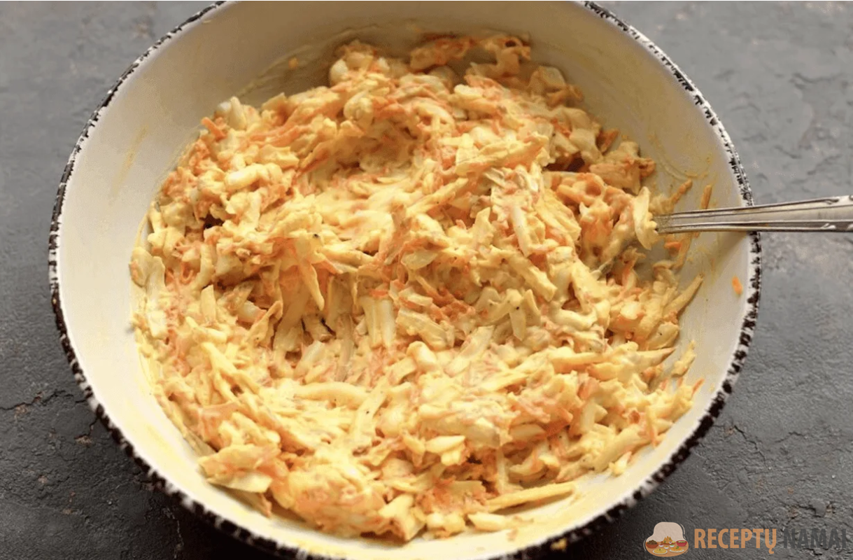 Dešros rūkytą sūrį sutarkuokite stambia tarka. Kiaušinius išvirkite iki kietos trintuvės, nulupkite, atvėsinkite, sutarkuokite baltymą ir trynį, sudėkite į sūrį. Nulupkite morkas, sutarkuokite jas smulkia tarka žalias, sudėkite į pagrindinę sudėtį. Nulupkite česnako skilteles, perkoškite per presą, sudėkite į salotas. Pagardinkite majonezu ir grietine, pabarstykite druska ir maltais pipirais. Gerai išmaišykite mišinį, visus ingredientus apliedami majonezo-grietinės padažu.