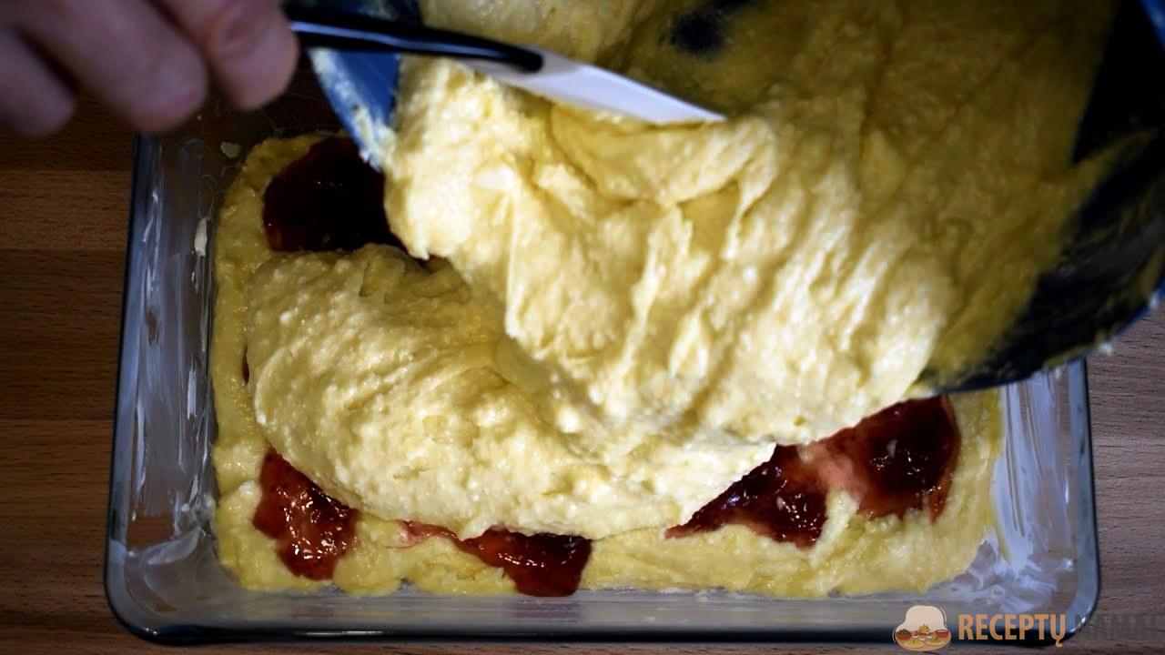 . Ištepkite formą sviestu arba augaliniu aliejumi. Į formą supilkite dalį tešlos, ant pyrago viršaus mentele užtepkite uogienės, tada trečiu sluoksniu sudėkite likusią