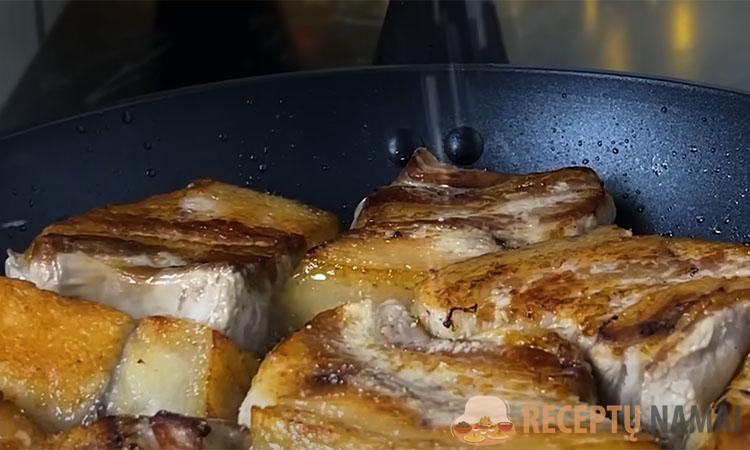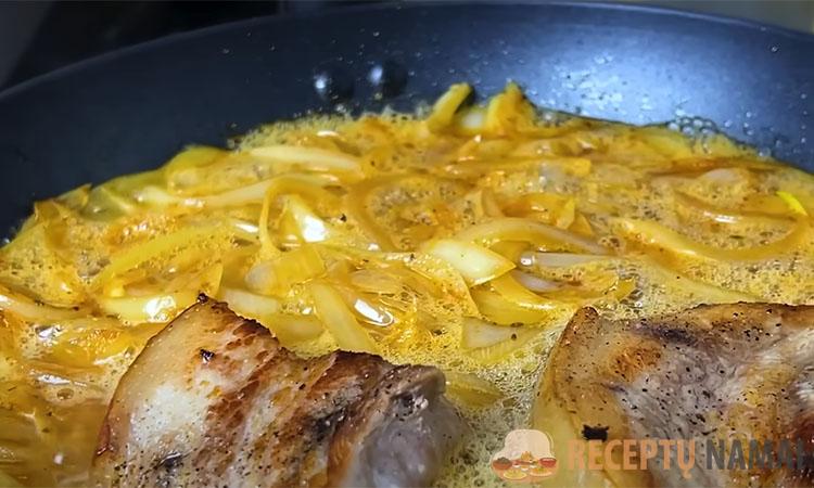Tada kepkite mėsą augaliniame aliejuje po 5 minutes iš kiekvienos pusės, kol paruduos, dabar nuimkite ją į šalį. Dabar supjaustykite svogūną pusžiedžiais ir kepkite 5 minutes.