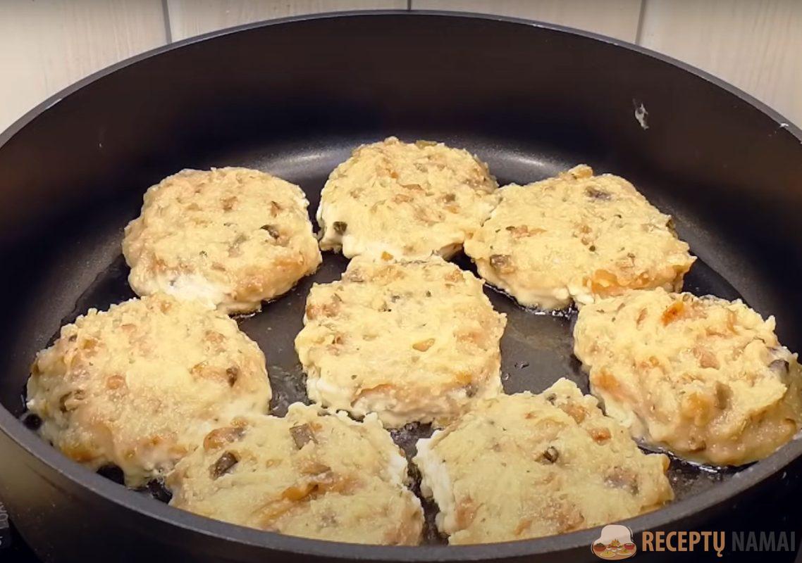 Keptuvėje įkaitinkite augalinį aliejų, šaukštu formuokite kotletus ir dėkite ant keptuvės paviršiaus. Kepkite kotletus iš abiejų pusių, kol taps auksinės spalvos.