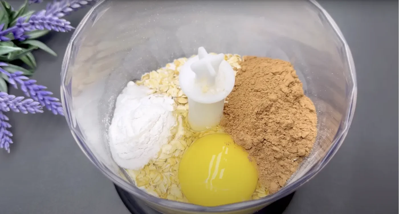 Paruoškite pagrindą. Sudėkite avižinius dribsnius, pieną, kiaušinį, druską, saldiklį, kepimo miltelius ir kakavos miltelius į trintuvo dubenį. Sumalkite.