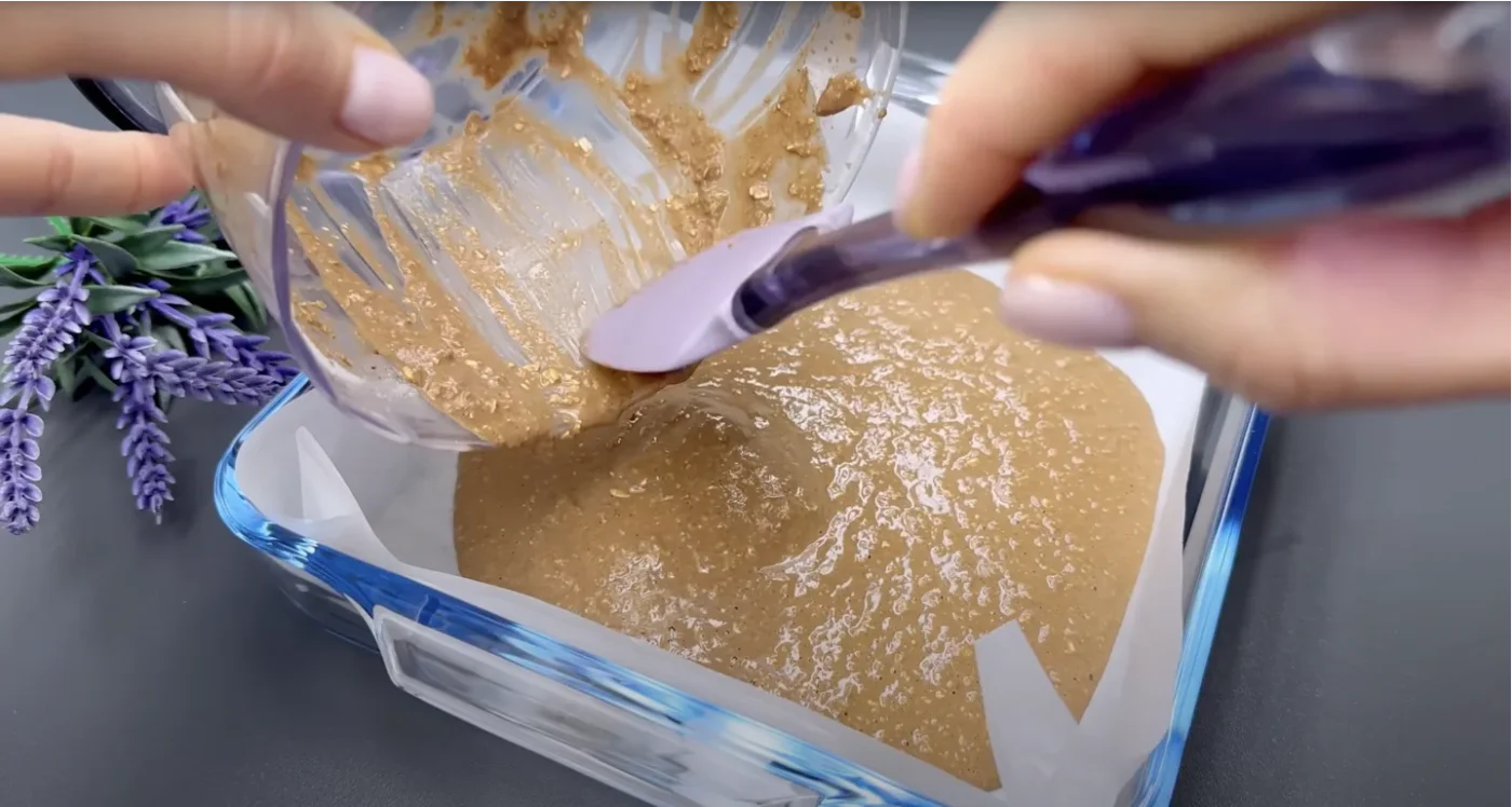 20 x 20 cm kepimo formą išklokite kepimo popieriumi. Supilkite tešlą į formos dugną ir kepkite iki 180 laipsnių įkaitintoje orkaitėje 15–20 minučių.