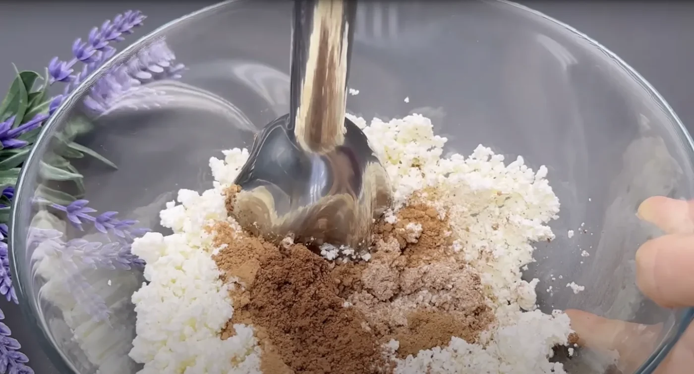 Sudėkite varškę, saldiklį ir kakavos miltelius į dubenį. Sutrinkite elektriniu trintuvu iki vientisos masės.