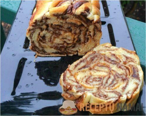 Tešlą iškočiokite storu stačiakampio formos sluoksniu ir susukite į ritinį. Sudėkite tešlą į pergamentu išklotą kepimo indą