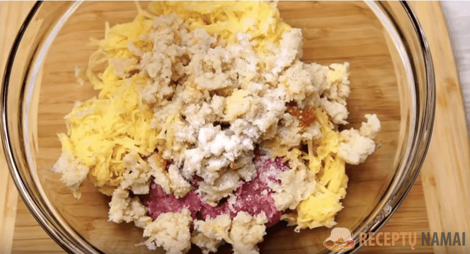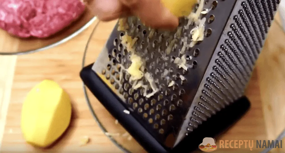 Į dubenį įdėkite 500 gramų maltos mėsos, sudėkite svogūną ir česnaką, bulves, gerai išspauskite duoną ir suberkite į maltą mėsą, minkydami ją rankomis.