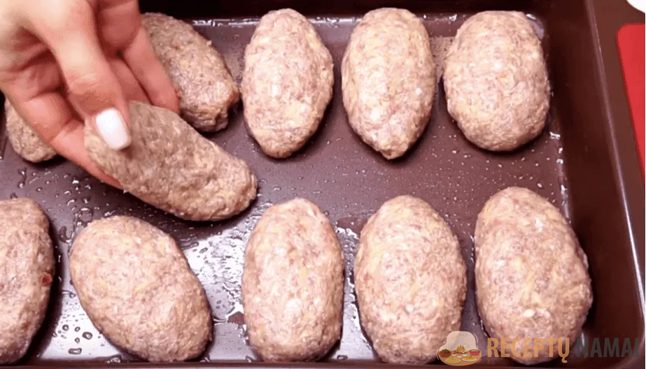 Formuojame kotletus, manieji sveria apie 80–90 gramų ir dedame juos ant kepimo skardos atstumu vienas nuo kito. Iš tokio kiekio maltos mėsos gaunu 11 kotletų.
