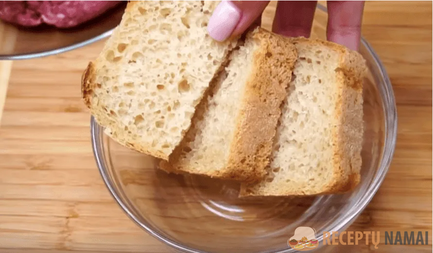 Norėdami pradėti, pamirkykite 3 riekeles duonos vandenyje ir atidėkite.