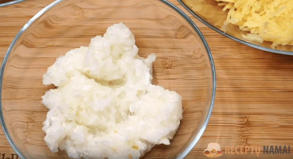 Tris skilteles česnako ir 1 svogūną susmulkinkite trintuvu.
