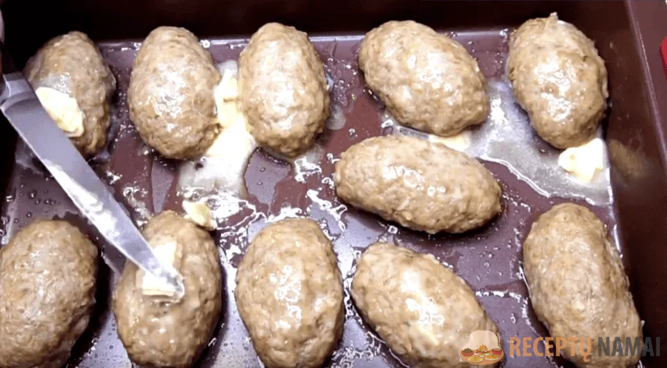 Ir kepkite kotletus dar 15 minučių orkaitėje. Išimkite kepimo skardą iš orkaitės ir patepkite kotletus susidariusiu sviestu iš skardos.