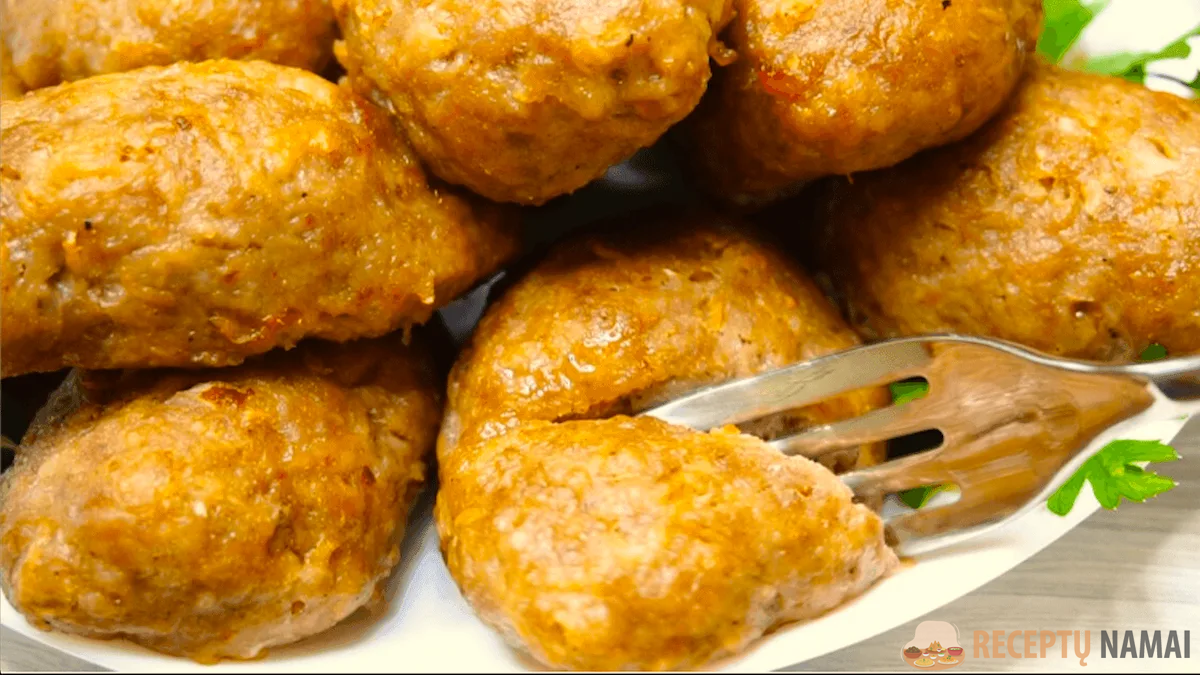 Formuojame kotletus, manieji sveria apie 80–90 gramų ir dedame juos ant kepimo skardos atstumu vienas nuo kito. Iš tokio kiekio maltos mėsos gaunu 11 kotletų.
