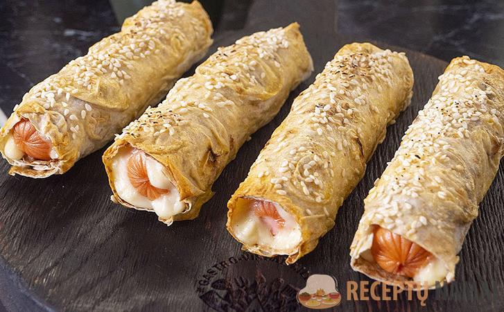 plonas lavašas, dešrelės, sūris, sezamo sėklos, kiaušinis, prieskoniai pagal skonį