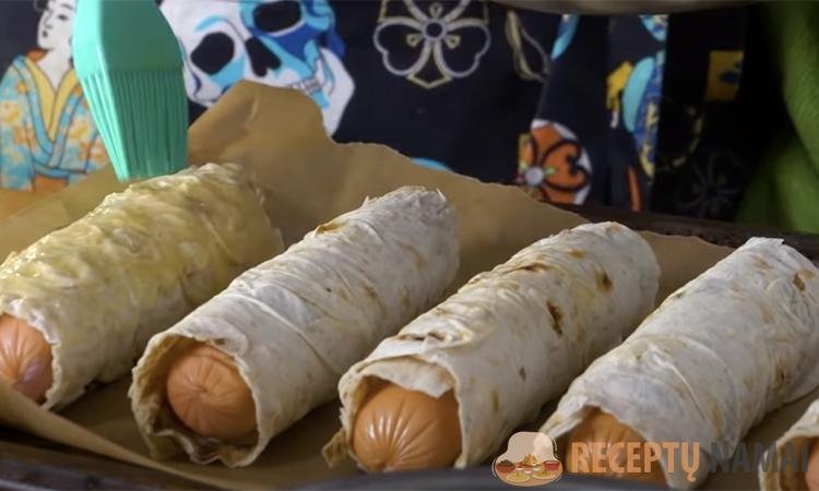 Lavašą supjaustykite juostelėmis. Ant pitos duonos juostelės krašto uždėkite sūrio riekelę ir suvyniokite dešreles.