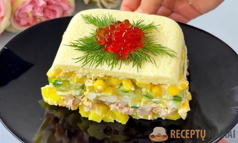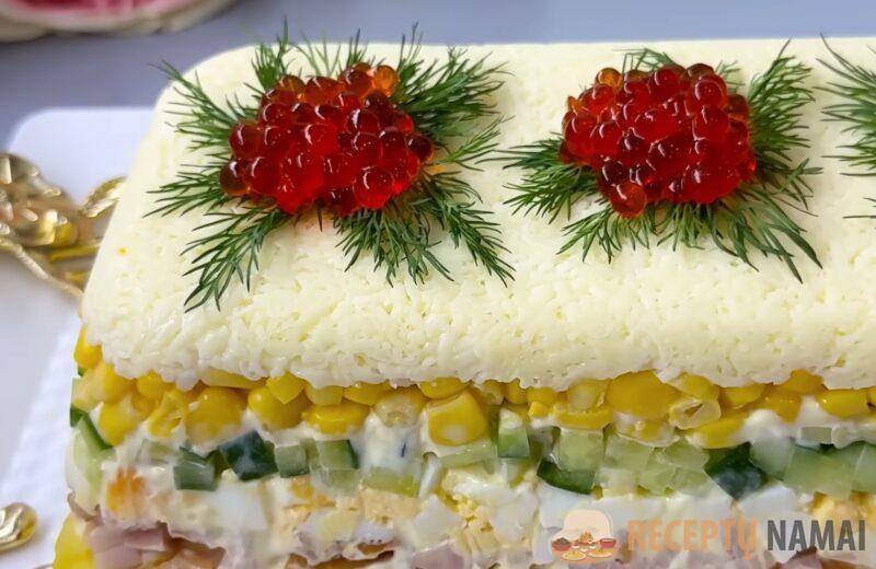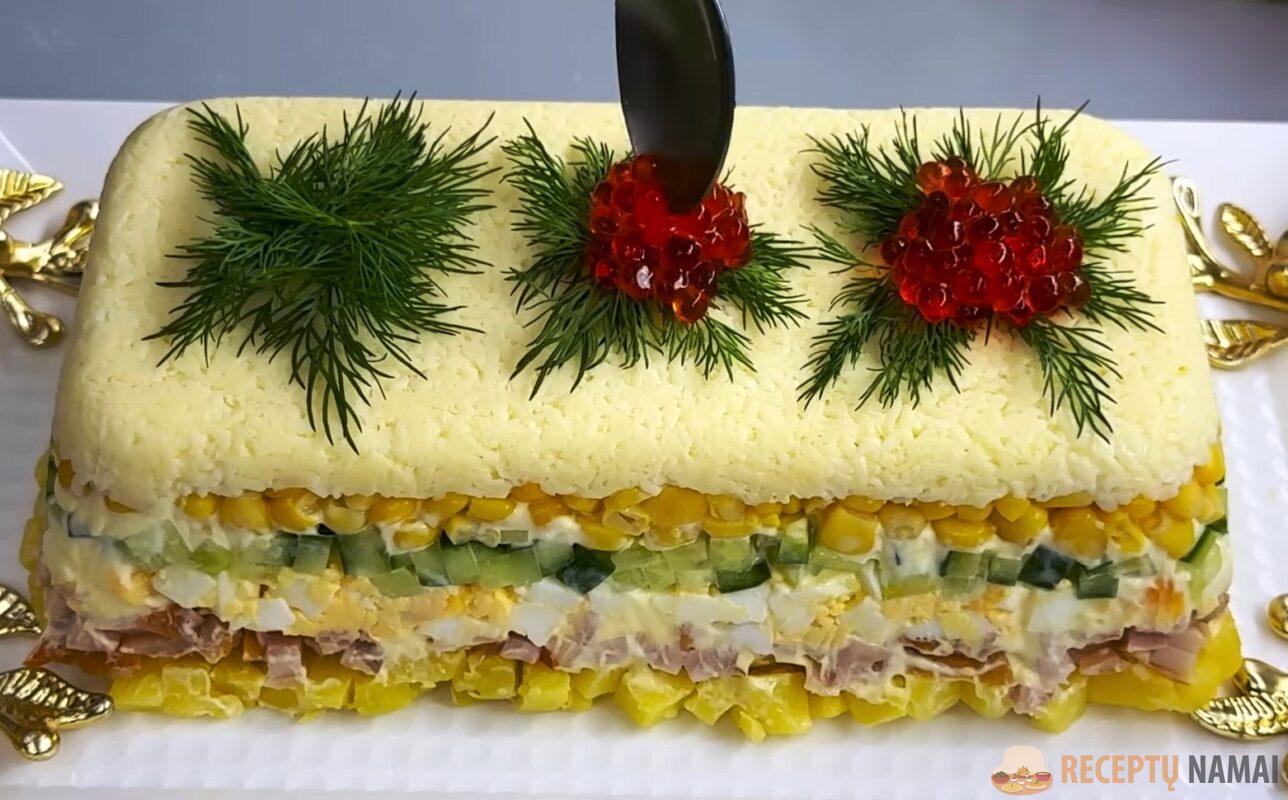 Sultingesnės ir gaivesnės salotos tampa dėl agurkų. Jame yra daug skysčio, kuris visada praverčia sluoksniuotoms salotoms. O už saldoką patiekalo skonį atsakingi konservuoti kukurūzai.