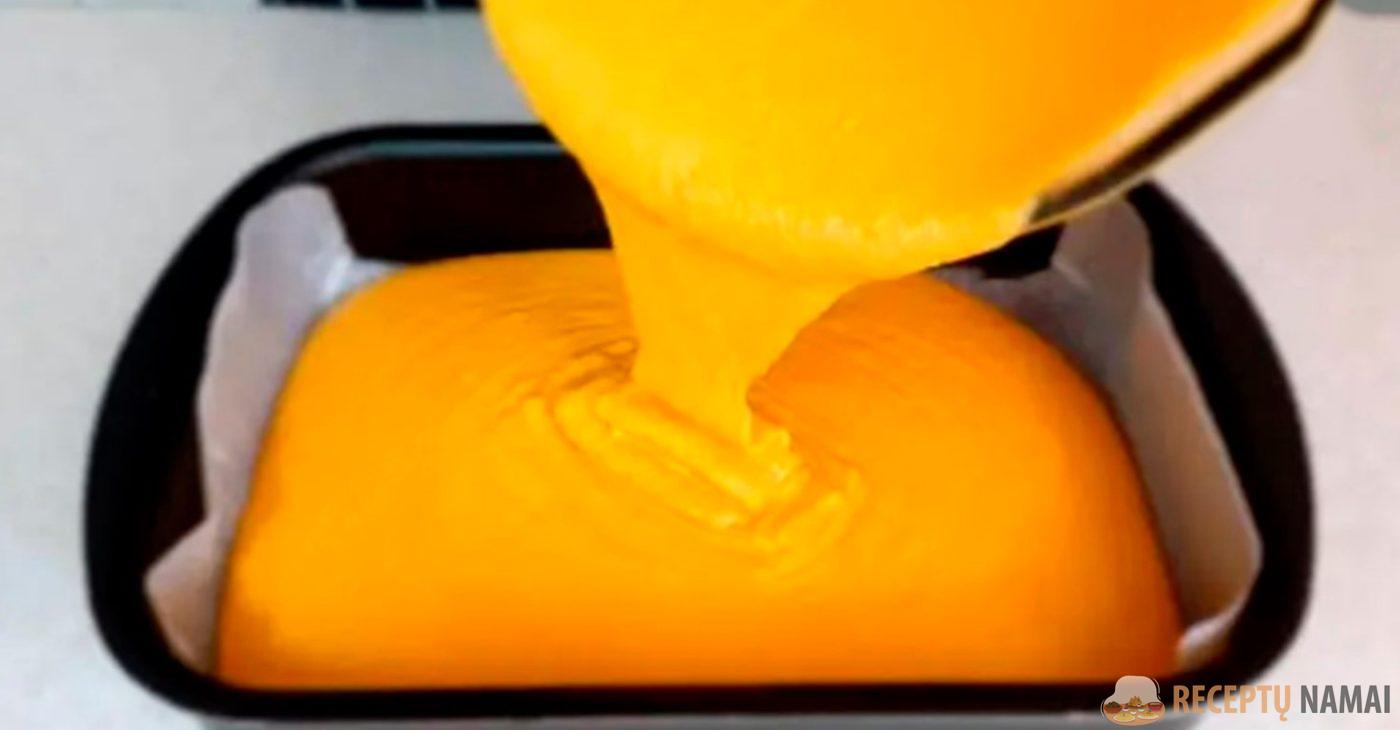 Formą išklokite pergamentu ir supilkite tešlą