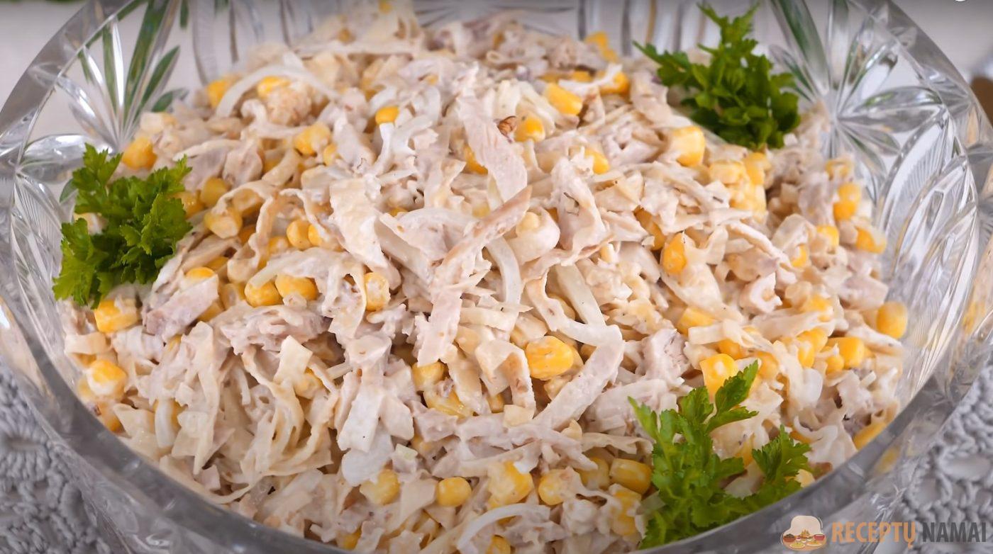 . 4-5 cm storio juostelėmis supjaustykite kiaušinių blynus, tada supjaustykite juos plonais šiaudeliais ir pridėkite prie mėsos ir riešutų. Į salotas sudėkite iš marinato išspaustą svogūną ir kukurūzus.