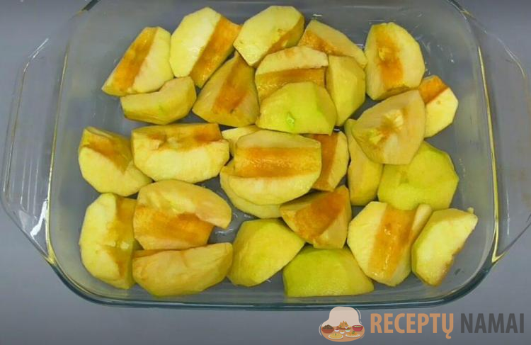 Pradedu nuo obuolių: nulupu, išimu šerdis, sudedu į sviestu pateptą kepimo indą. Įpilu apie 100 ml vandens ir pašoju į iki 180 laipsnių įkaitintą orkaitę 30 minučių.