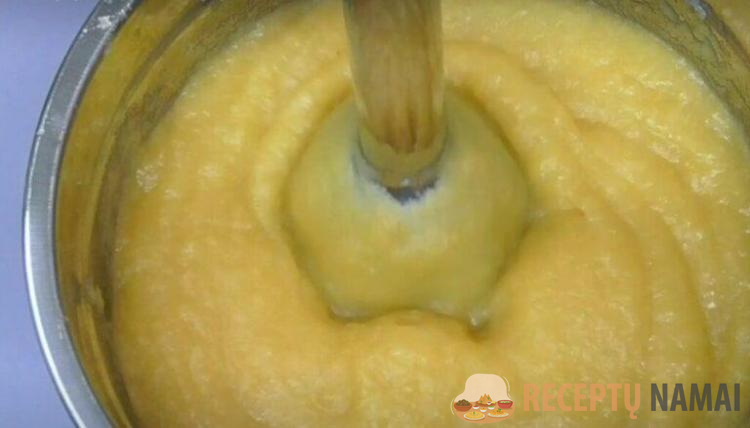 Suminkštėjusius obuolius perkeliu į gilų dubenį ir panardinamuoju trintuvu sutrinu iki vientisos masės.