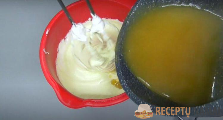 Tada į kiaušinių baltymus palaipsniui įberiu 150 g cukraus ir įpilu citrinos rūgšties. Plakau toliau, kol mišinys tampa tirštas ir stabilus, su skaidriomis viršūnėmis. Paruoštą morengą dedu į šaldytuvą, o tuo tarpu į puodą įberiu 200 g obuolių padažo.