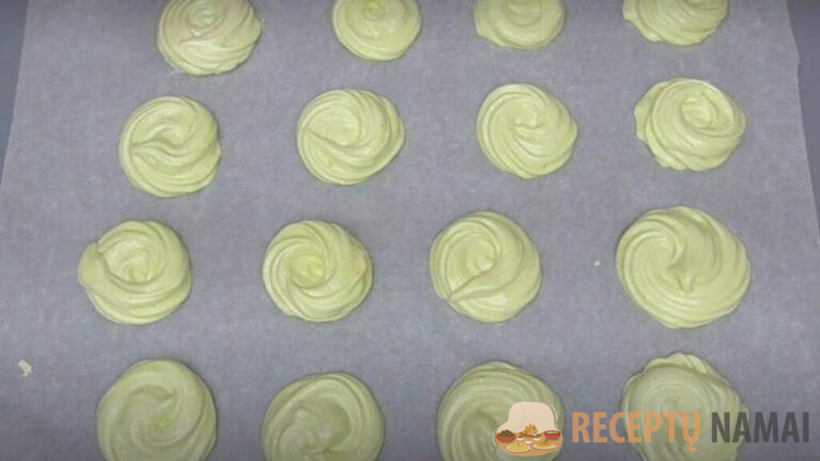 Karštą tyrę iš karto supilu į kiaušinių baltymų mišinį ir plaku mikseriu, kol masė taps tiršta ir stabili. Nedelsdama perkeliu mišinį į konditerinį maišelį su žvaigždės formos antgaliu ir dedu zefyrus ant maistinės plėvelės.