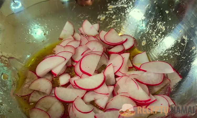 Pirmiausia išvirkite kiaušinius. Tą patį laiką išimkite iš šaldytuvo ir įdėkite juos į verdantį pasūdytą vandenį ir virkite lygiai 9 minutes. Nedelsdami perkelkite į ledinį vandenį, kad juos būtų lengva nulupti ir jie išlaikytų kreminę trynio tekstūrą. Nulupkite kiaušinius ir supjaustykite plonais žiedais. Padažui sumaišykite actą, alyvuogių aliejų ir Dižono garstyčias, maišykite, kol susidarys vientisa emulsija. Laiškinius svogūnus supjaustykite plonais žiedais ir sudėkite į padažą. Ridikėlius ir agurkus supjaustykite plonais griežinėliais.