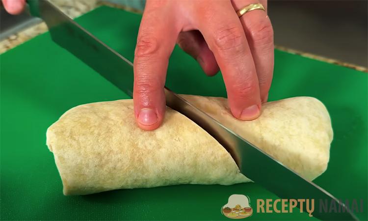 Paruoštą ritinį patogu laikyti šaldytuve, pasiimti su savimi kelyje arba patiekti iš karto, supjaustytą porcijomis.