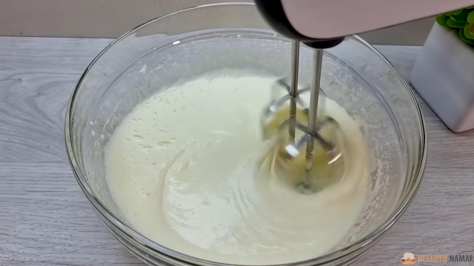 Kremui Kiaušinius sumaišykite su cukraus pudra ir vaniliniu cukrumi, tada po vieną suberkite miltus ir krakmolą.