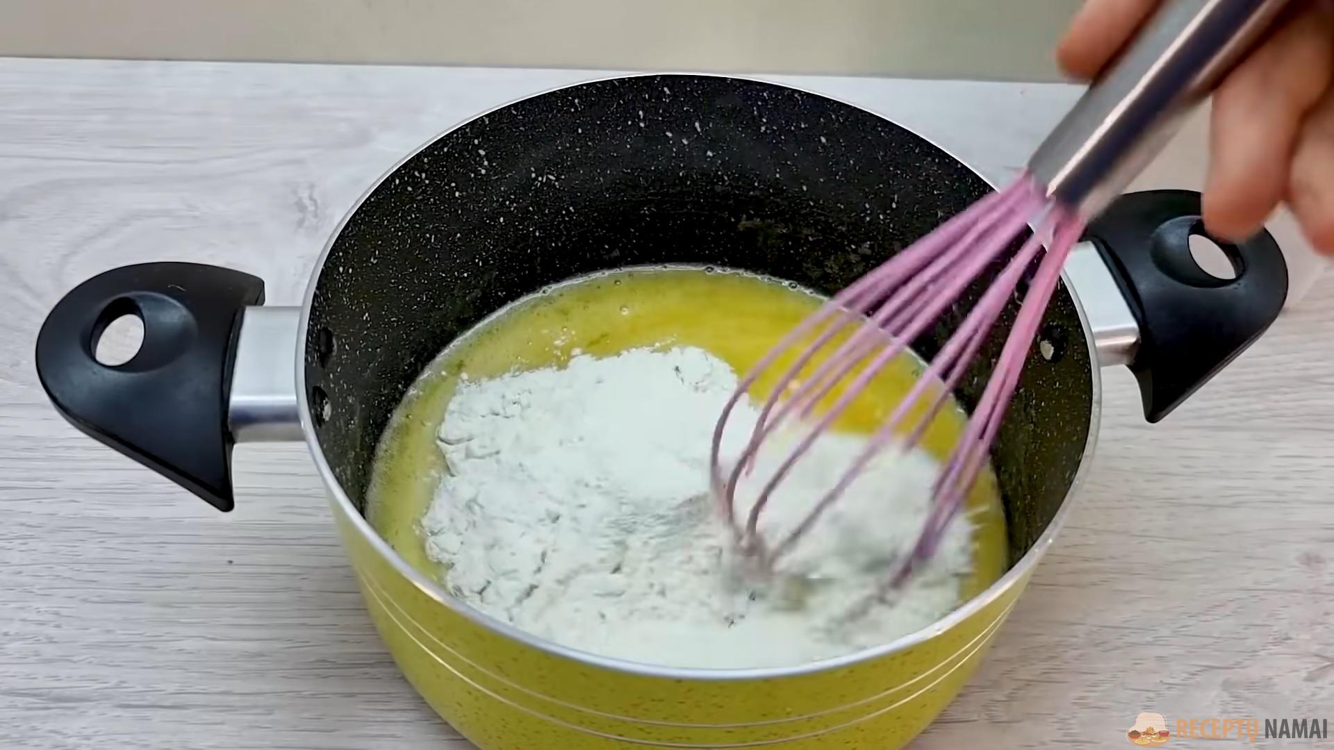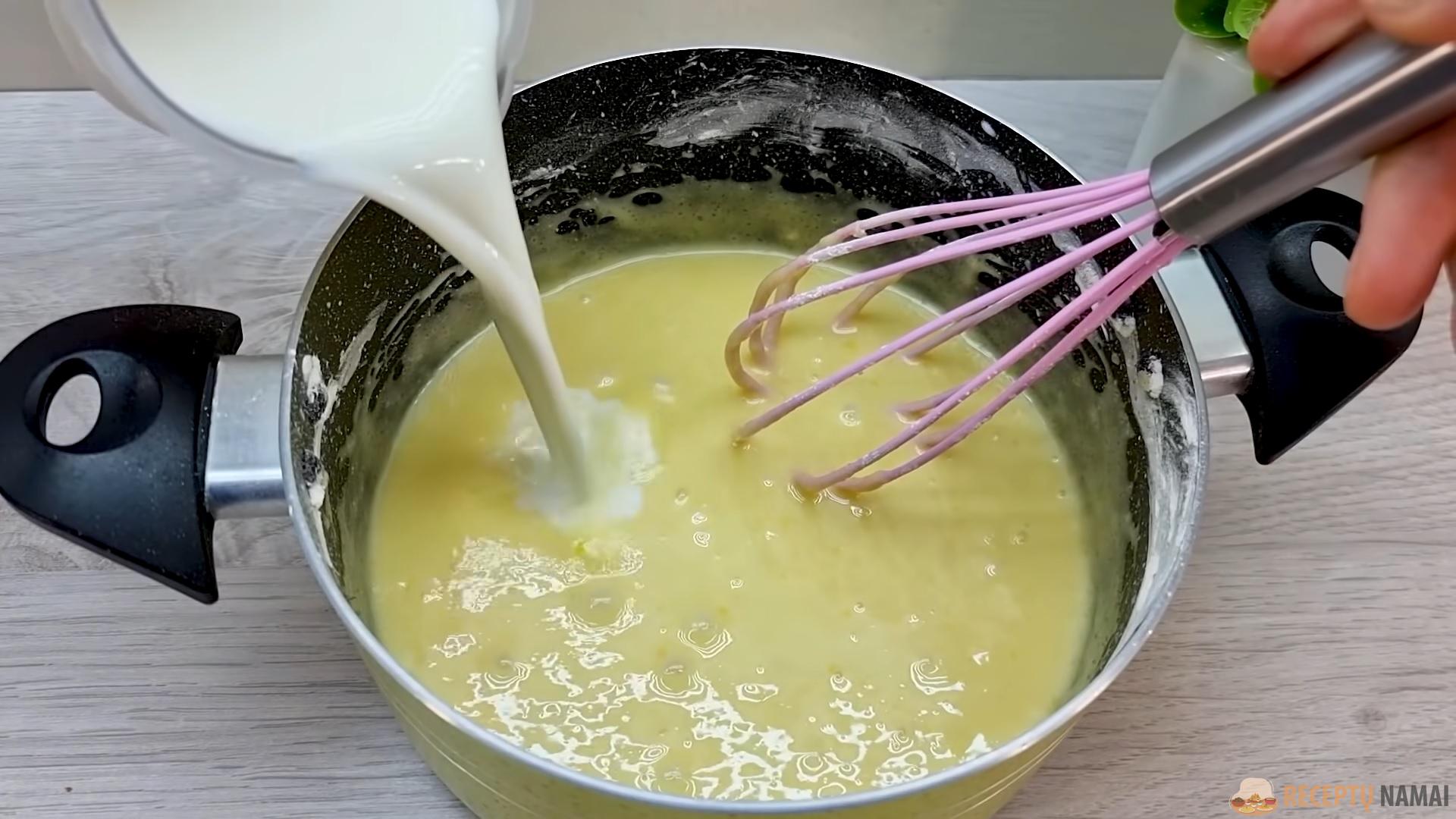 Palaipsniui supilkite pieną, labai gerai išmaišykite iki vientisos masės.