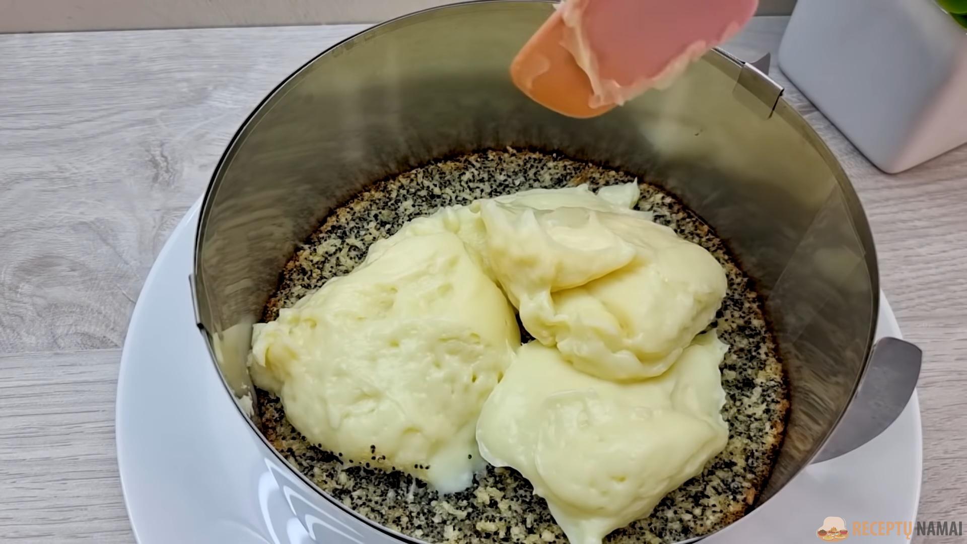 Supilkite grietinėlę ir išmaišykite, tada suberkite kokosus ir aguonas.
