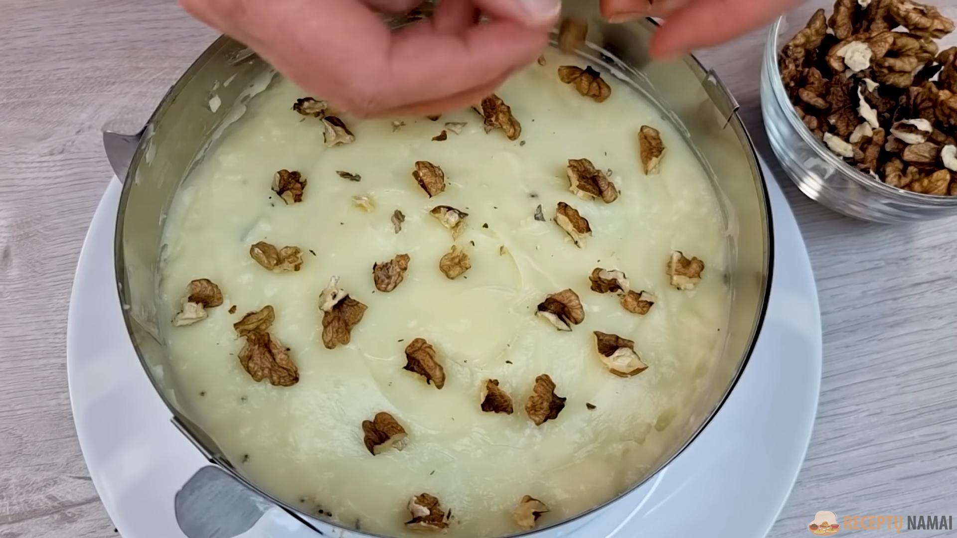 Surinkimas : viršus, kremas, viršus, kremas, graikinių riešutų gabalėliai, viršus, kremas. Kremo taip pat paliekame papuošimui.