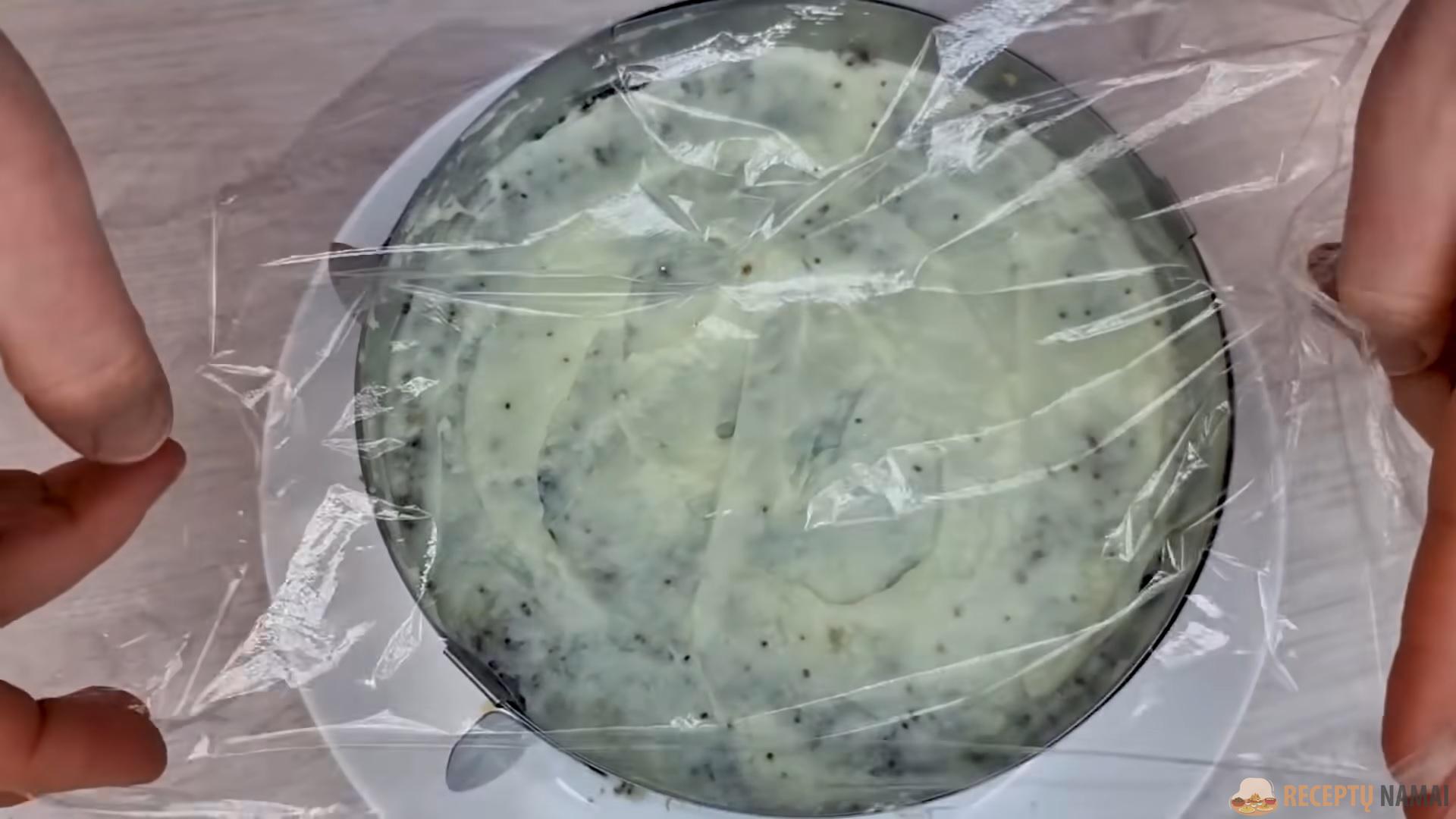 Kepimo skardą uždengiame maistine plėvele ir dedame tortą į šaldytuvą per naktį arba bent 4 valandoms.