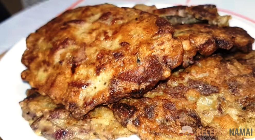 Šiuos gabalėlius reikia sumaišyti su kubeliais supjaustytais svogūnais, kiaušiniais ir miltais. Jei po ranka neturite kukurūzų miltų, naudokite įprastus miltus arba krakmolą. Viską sumaišykite, įberkite druskos ir pipirų.