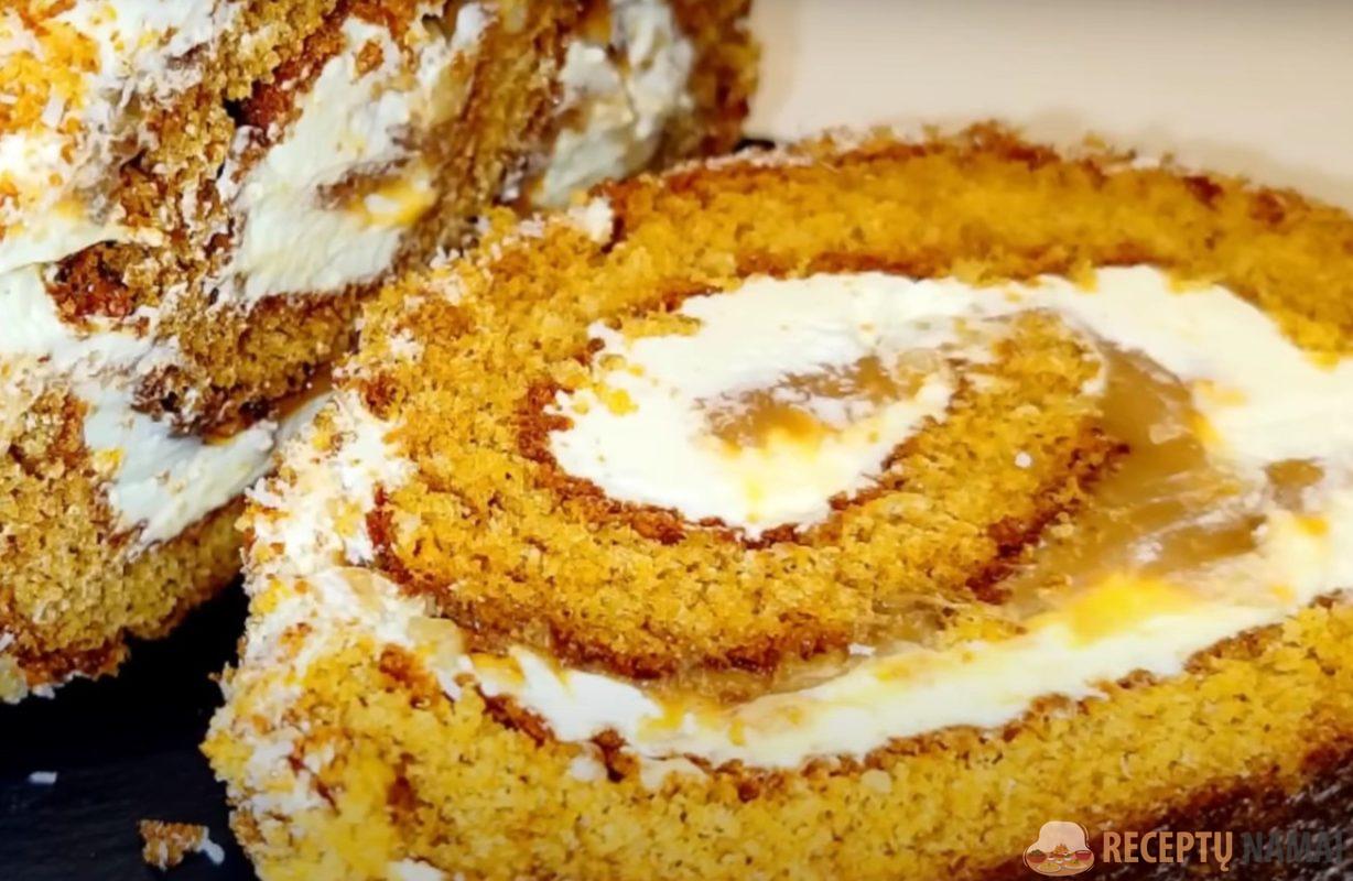 Gaunasi skanus vyniotinis, panašus į “Medovik”. Šis saldus desertas patiks visiems svečiams.