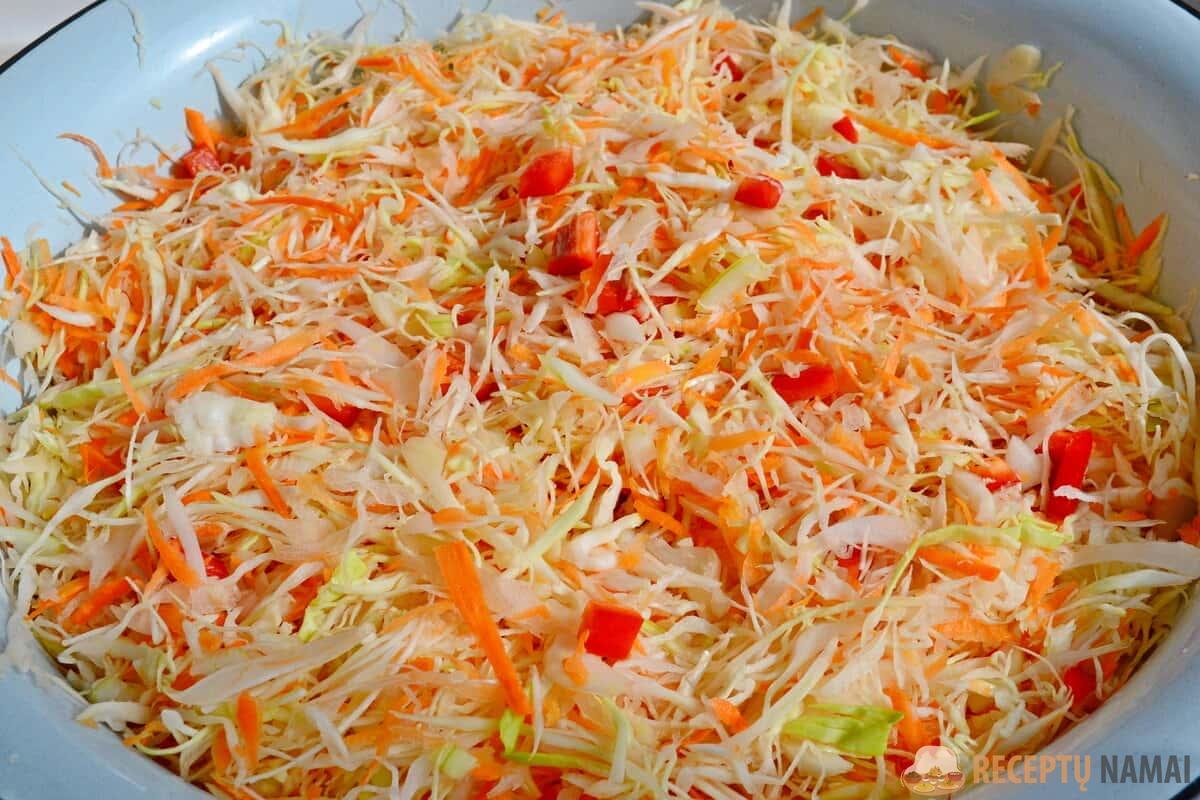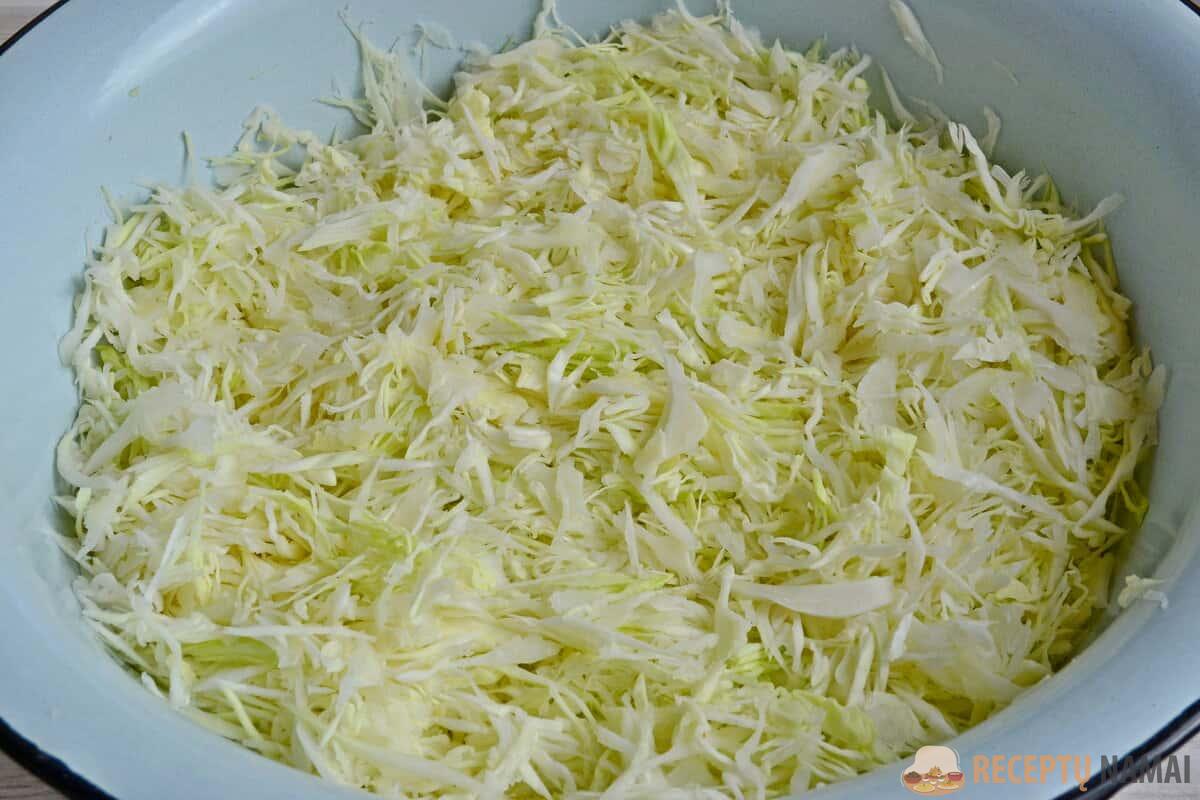 Pagrindinį vaidmenį šiose salotose atlieka kopūstai. Susmulkinkite kopūstus taip, kaip esate įpratę, ir sudėkite juos į didelį dubenį (arba puodą).