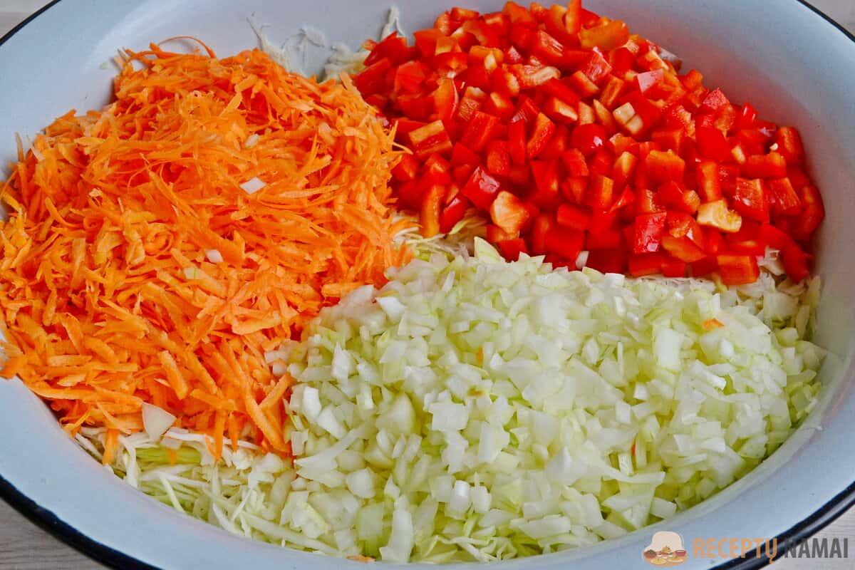 Išvalykite papriką nuo sėklų ir supjaustykite nedideliais kvadratėliais, morkas nulupkite ir sutarkuokite stambia tarka, svogūną (jei įmanoma) nulupkite ir smulkiai supjaustykite. Paruoštas daržoves sudėkite į kopūstus.