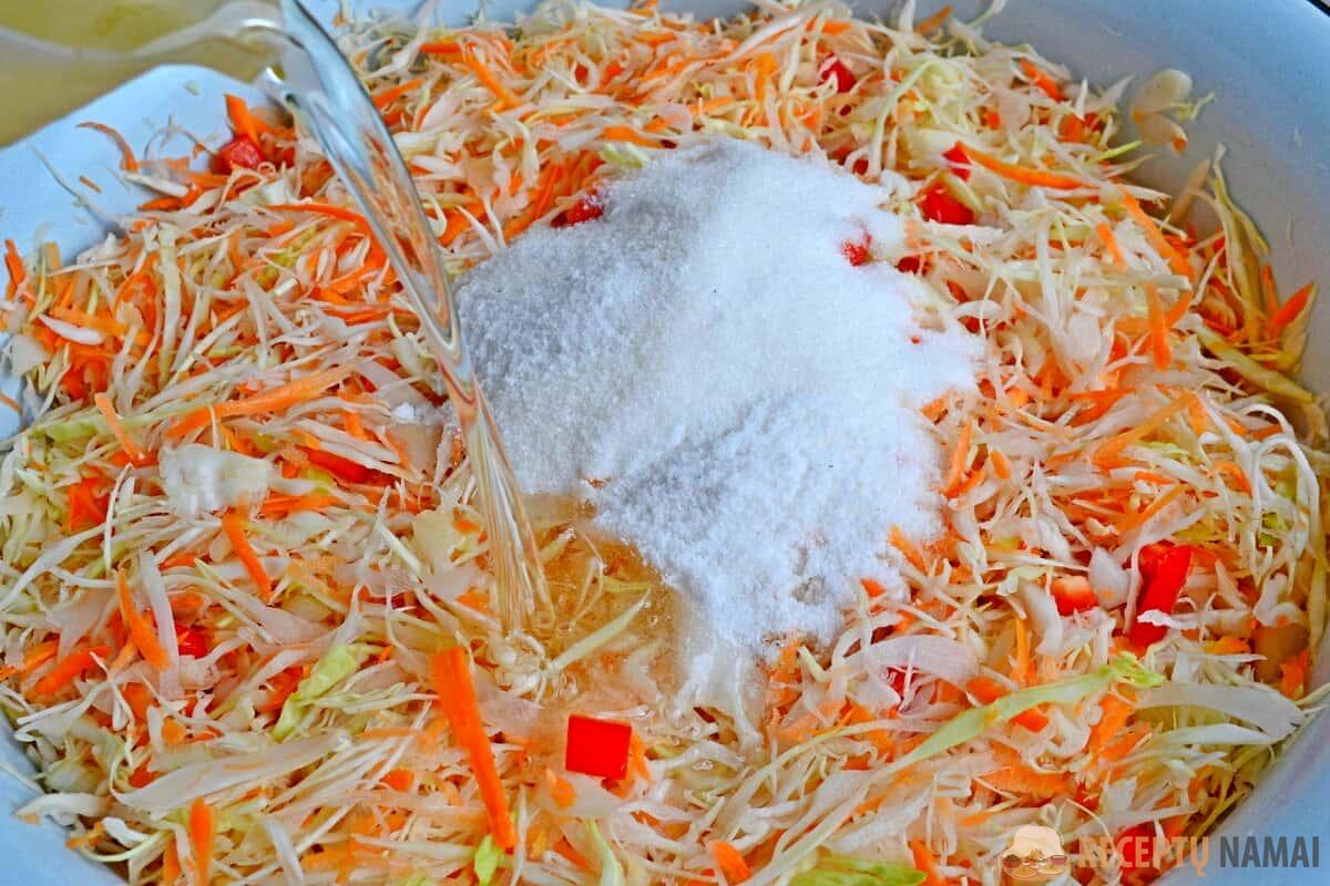 Dabar įberkite druskos, cukraus, augalinio aliejaus ir acto. Dar kartą gerai išmaišykite, kol cukrus ištirps.