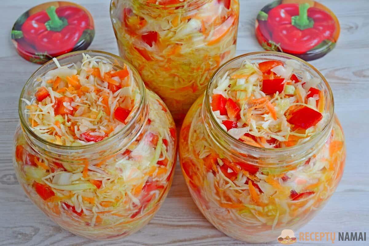 Salotos turėtų kurį laiką pastovėti (apie 3-5 dienas), pasimarinuoti, ir galima valgyti. Tačiau jei jos stovės ilgiau, taps dar skanesnės. Salotos puikiai laikosi ir gana ilgai (kelis mėnesius). Vieną stiklainį palieku šaldytuve, o kitus siunčiu į rūsį.