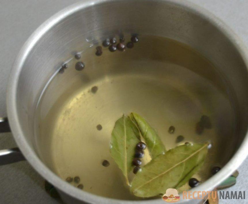 1. Paruoškite marinatą – į vandenį supilkite aliejų, actą, įdėkite lauro lapą, žirnelius ir druską. Užvirinkite.