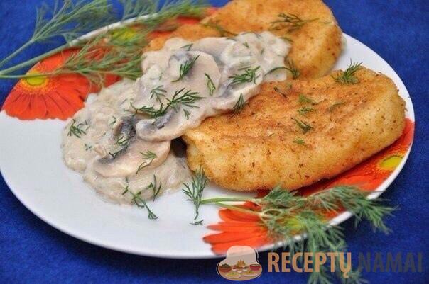 - Bulvių kotletus užpilkite padažu ir patiekite. Mėgaukitės!