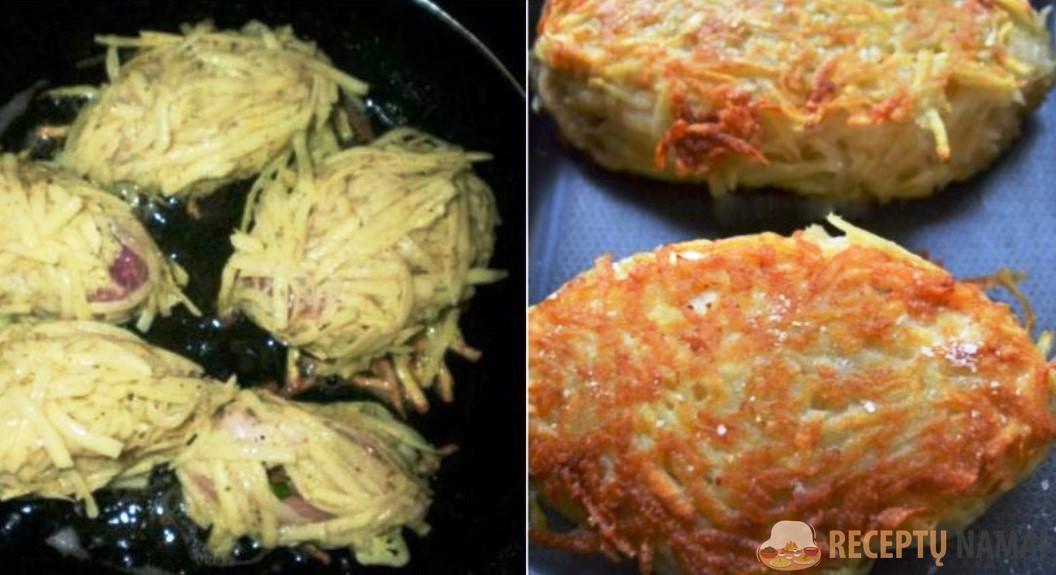 Iš pradžių apvoliokite kotletus miltuose, tada plaktuose kiaušiniuose, tada tarkuotose