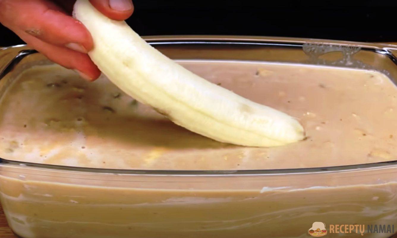 Supilkite masę į sviestu išteptą formą. Į masę įdėkite vieną visą bananą, uždenkite maistine plėvele ir palikite šaldytuve 5 valandoms.