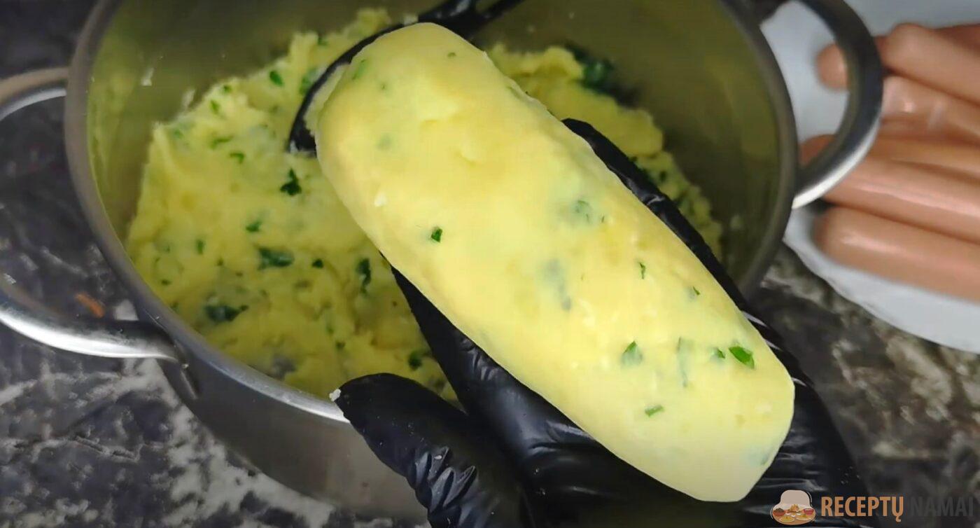 . Iš bulvių košės suformuokite plokštainį ir į jo vidurį įdėkite dešrelę. Tada suvyniokite į ritinėlį taip, kad dešrelė būtų viduje.