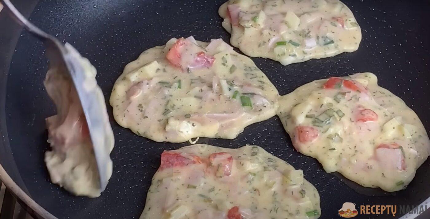 Tą patį padarykite su kumpiu ir sūriu. Į gautą tešlą įmaišykite supjaustytą pomidorą, sūrį ir dešrą, gerai išmaišykite.