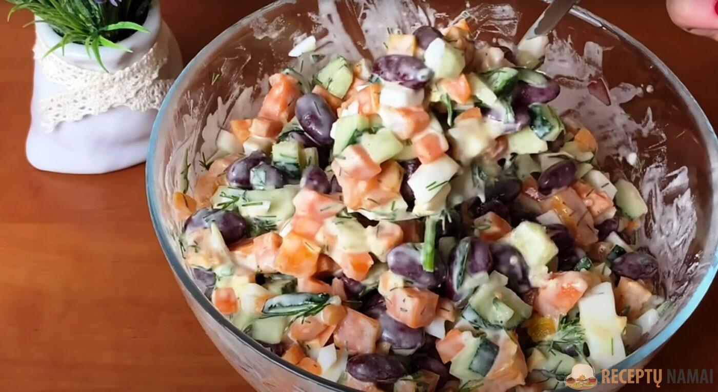 Salotos labai apetitiškai kvepia, tačiau joms trūksta druskos. Jos įberiame pagal skonį. Užpilame dviem šaukštais majonezo. Galite naudoti ir naminį, ir parduotuvėje pirktą majonezą. Atėjo laikas sumaišyti ingredientus.