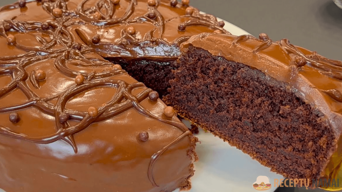 Šokoladą ištirpinkite mikrobangų krosnelėje arba vandens vonelėje, supilkite į jį sviestą. Viską sumaišykite, kol gausite vientisą masę, ir aptepkite ja pyragą. Papuoškite tortą savo nuožiūra. Kaip variantą – įtrinkite šokoladą arba užpilkite grietinėlės, kondensuoto pieno. Tortas išeis minkštas, sodraus skonio ir nuostabaus šokolado aromato. Galite būti tikri, kad jis tuoj pat iškeps.